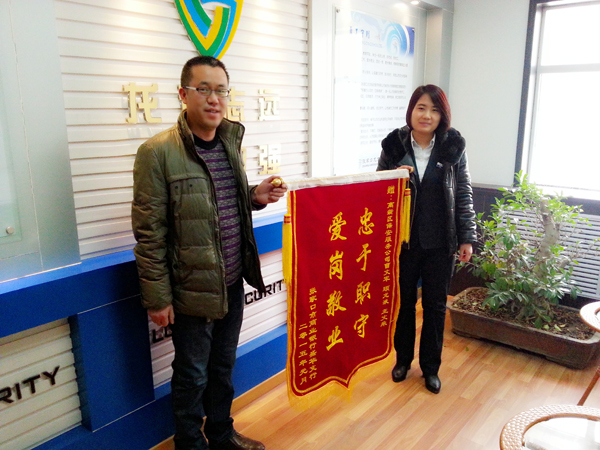 2015年1月份,一位八十多歲高齡的老人到張家口市商業(yè)銀行某支行辦理取錢業(yè)務(wù)時,因老人年事已高患有老年病,與銀行的工作人員發(fā)生了沖突,無論工作人員如何解釋,仍無法溝通,至此,老人經(jīng)常到該行找工作人員滋事,老人的行為嚴(yán)重影響到支行的正常業(yè)務(wù),為客戶辦理業(yè)務(wù)帶來了不便,為維護(hù)好銀行正常秩序,我公司派駐支行的保安隊(duì)員顧龍液、王文來,主動接近老人進(jìn)行勸阻,交流溝通,問寒問暖,緩解老人心態(tài)。之后我公司曹文平隊(duì)長得知此事,也趕到支行協(xié)助處理,幫忙找到了老人的家人,在家人的勸說下,老人離開了支行,支行恢復(fù)了正常的工作秩序。經(jīng)過此事,我公司保安大隊(duì)長曹文平及派駐到張家口市商業(yè)銀行的保安隊(duì)員顧龍液、王文來受到了張家口市商業(yè)銀行支行領(lǐng)導(dǎo)的高度贊揚(yáng),特到我公司送來了錦旗與表揚(yáng)信,對我公司進(jìn)行感謝。